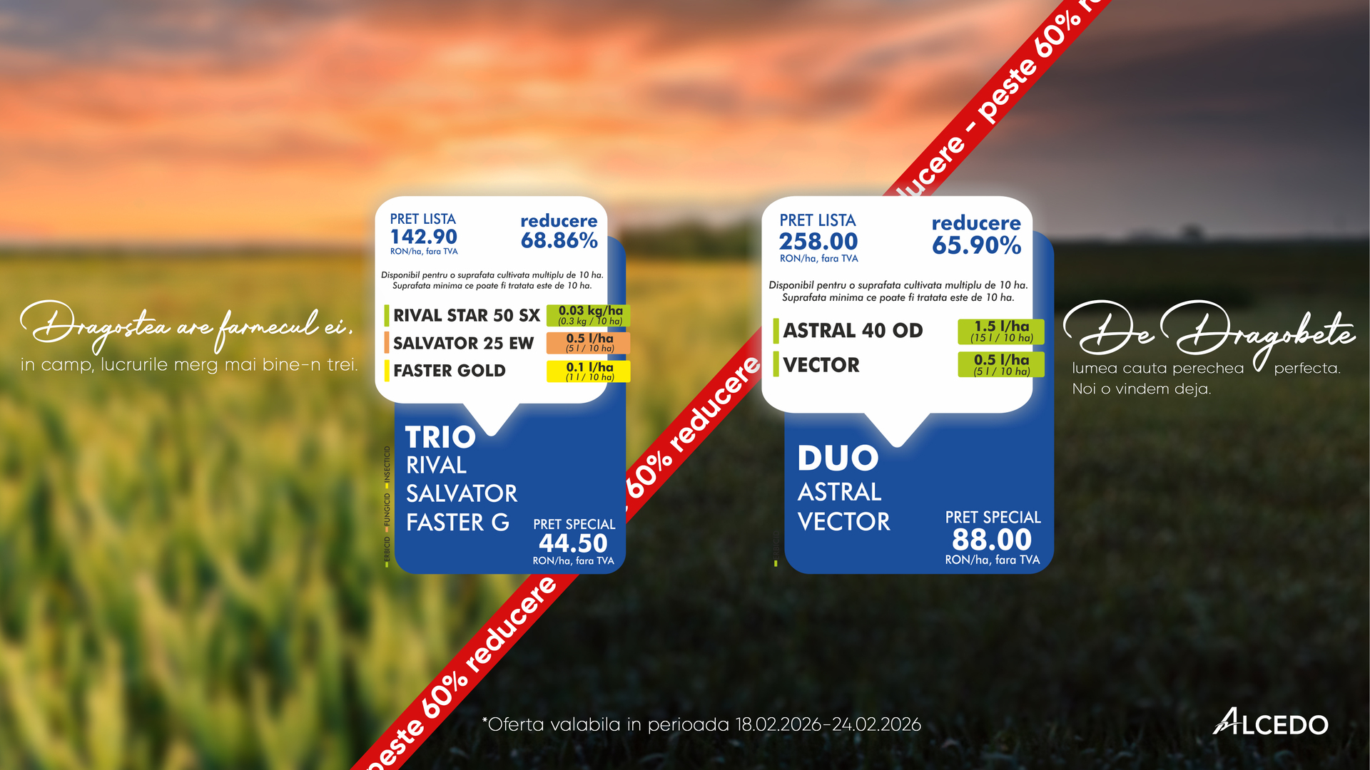 De Dragobete, mesajul din câmp este simplu: succesul începe cu alegerea corectă a produselor care lucrează împreună. În această perioadă, ALCEDO propune două pachete tehnologice dedicate unora dintre cele mai importante culturi din România, porumb și grâu, construite pentru control, echilibru și rezultate clare în fermă.